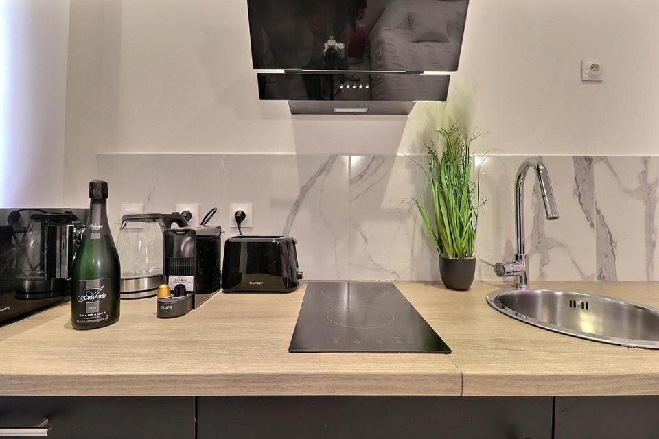 Appartement 1 Chambre. This apartment features a private pool and a hot tub. In the well-fitted kitchen, guests will find a stovetop, a refrigerator, a microwave and a tea and coffee maker. This apartment has air conditioning, a private entrance, flat-screen TV with cable channels, as well as winechampagne for guests. The unit has 1 bed.
