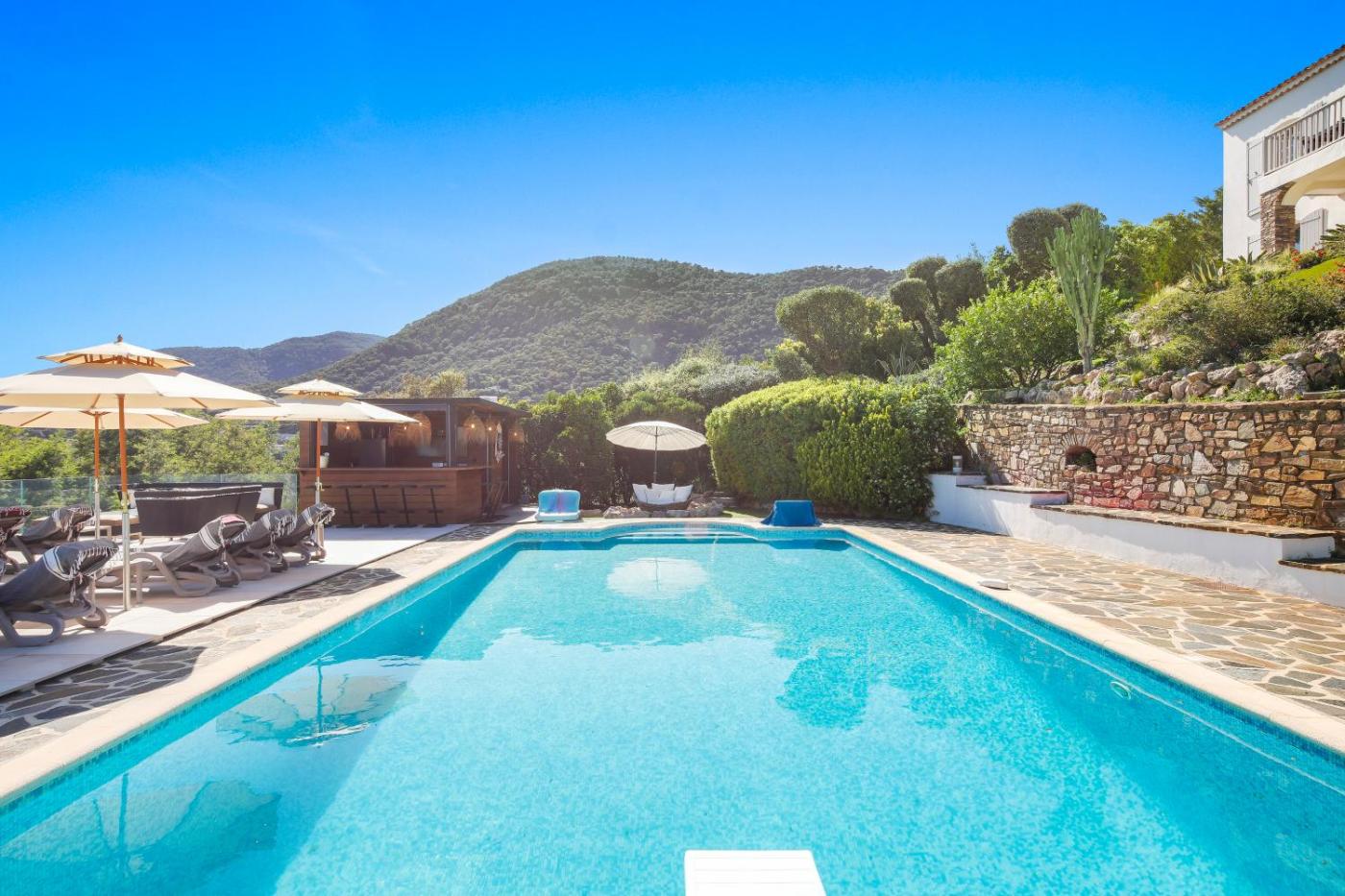 Villa - Vue sur Mer. This villas standout features are the pool with a view, hot tub and fireplace. Featuring a private entrance, this air-conditioned villa consists of 1 living room, 6 separate bedrooms and 6 bathrooms with a walk-in shower and a bath. Guests will find a stovetop, a refrigerator, a dishwasher and kitchenware in the fully equipped kitchen. The villa also offers a barbecue. The spacious villa provides a washing machine, soundproof walls, a minibar as well as a terrace with sea views. The unit offers 8 beds.
